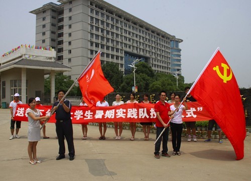 此次活动的发起者和领队——政治与法学学院党总支书记张兆学和副院长吴敏从我校学工部副部长岳蓓和党群工作部蔡菁手中接过党旗和活动队旗,并郑重承诺要圆满完成“手拉手”献爱心和“送教下乡”大学生暑期社会实践活动任务。他们将在7月20日带领5名同学赴玉树州曲麻莱县民族中学进行为期一个星期的支教活动。