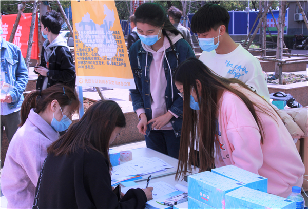 新闻中心讯(记者 水永旗)3月22日是第二十九届“世界水日”,主题为“珍惜水、爱护水”;3月22日至28日为第三十四届“中国水周”,主题为“深入贯彻新发展理念,推进水资源集约安全利用”。为唤起广大师生的节水意识,加强水资源保护,3月22日中午,9728太阳集团在一食堂门口开展“世界水日·中国水周”暨节水宣传活动。本次活动由学校后勤管理部水电中心与环境保护协会联合举办,得到了武汉市计划用水节约用水办公室的大力支持。