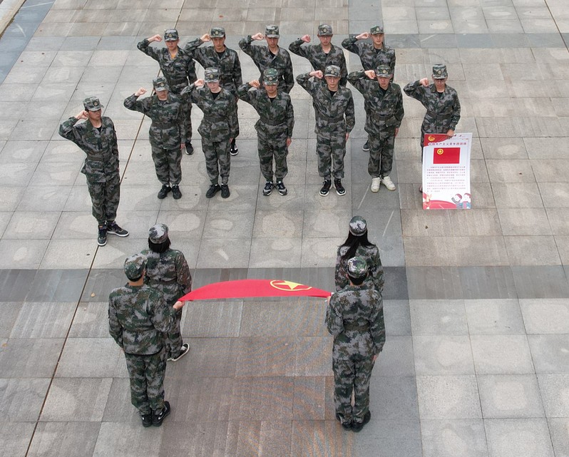 快闪现场,身着民国青年服装的学生们演绎“五四”爱国运动的情景,致敬和弘扬先辈们的爱国精神;团旗前,学生们庄严宣誓;身穿防护服的青年志愿者,正在开展测温等防疫志愿服务……