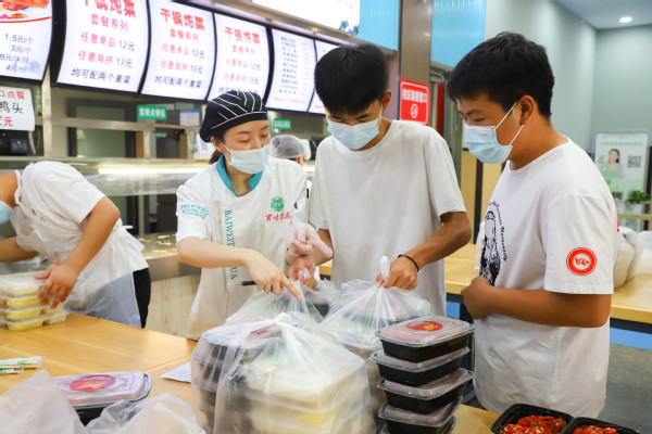 为了确保现场秩序井然并符合防疫要求,1.8万份校庆餐分时段分批发放。食堂共设置了42个学生窗口、3个教职工窗口供广大师生领取,所有学生以班级为单位按照固定时间分批到食堂固定窗口领取,教职工凭餐券到食堂指定窗口领取。学校学生工作部还招募了320名师生志愿者,帮忙打包和分发校庆餐。