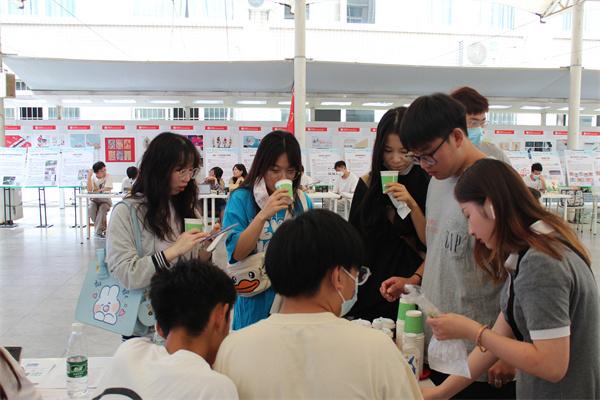 图为学生参观石斛系列饮品项目并现场品尝 摄影:李莹莹