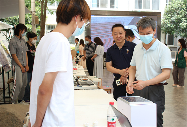 在环生学院学生团队研发的太阳能温湿自控器小型装置前,孔建益校长向学生详细询问了项目的研究意义、研究创新、研究成果、研究应用等,并给予技术上的指导,鼓励学生团队要拓展思路、大胆创新,把设计思路付诸于实际研究,把创意变成产品,投入应用。