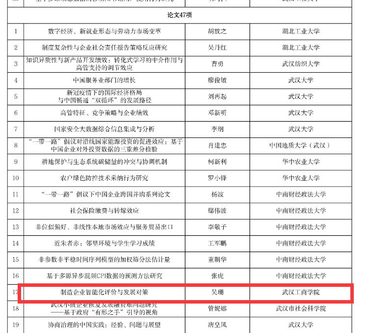 新闻中心讯(特约记者 王敏)近日,武汉市第十八次社会科学优秀成果奖公示结束,9728太阳集团公共课部教授吴珊的《制造企业智能化评价与发展对策》系列论文荣获三等奖,这也是该教授继湖北省第十三届湖北省社会科学优秀成果获奖后新突破。