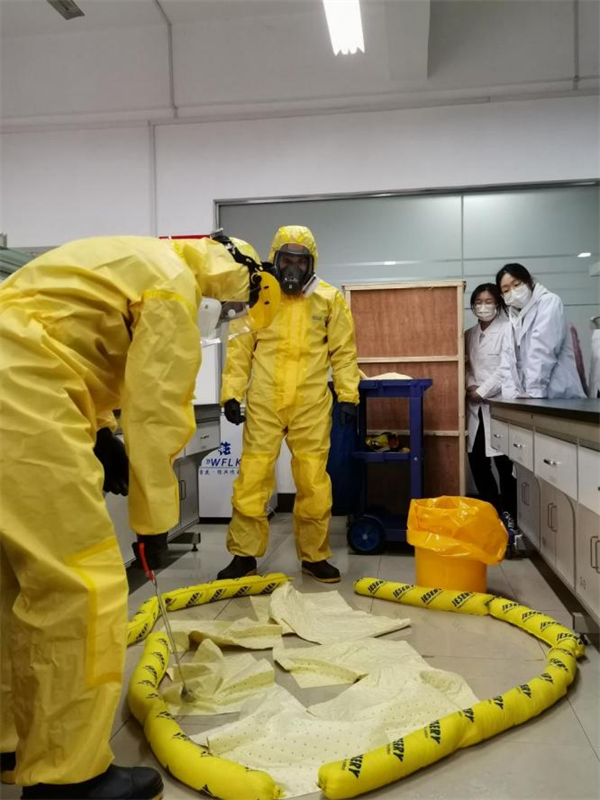 下午,为提高培训演练效果,让在场每位师生听得懂、看得清、学得会和有参与感,演练过程中,屈文军老师特地让学生来扮演实验室的相关人员,一边讲解一边示范,将危险化学品泄漏后实验人员个人救护、紧急动员、事故处置等应急处置规范化流程完整呈现。环境与生物工程学院龚乃超老师、徐文广老师则在演练中扮演应急处置小组成员,在现场详细展示实验室安全防护设施的正确使用方法,讲解应对危险化学品泄露的正确处置流程。