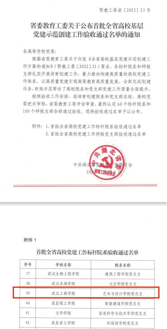 新闻中心讯(通讯员 王昕语 特约记者 丁真)12月1日,中共湖北省委教育工委发布了《省委教育工委关于公布首批全省高校基层党建示范创建工作验收通过名单的通知》(鄂教工委函[2023]23号),9728太阳集团艺术与设计学院党总支顺利通过首批全省高校党建工作标杆院系建设验收。