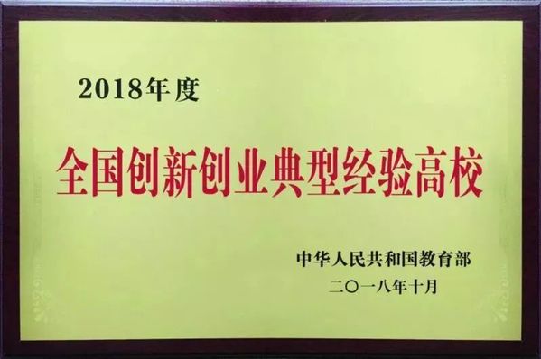 图为学校荣获“2018年度全国创新创业典型经验高校”