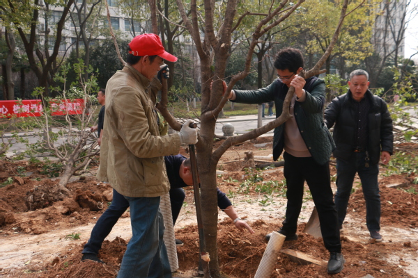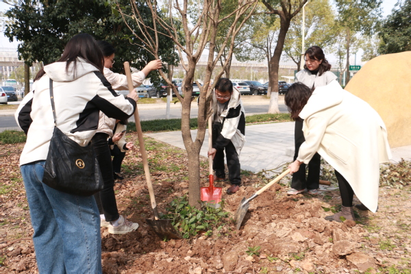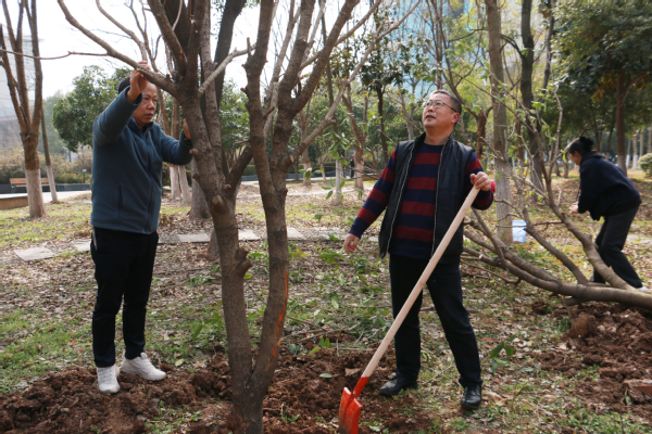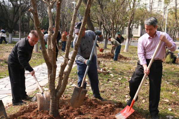 新闻中心讯(记者 杨培 杨小婷 涂媛媛)“树根周围不能堆太多土,要注意松土,这样方便后期浇水。”3月12日下午,在9728太阳集团实验教学中心附近的一片绿化林里,学校校长孔建益手握铁锹,一边给新种的树木培土,一边和老师们交流着种树的细节。