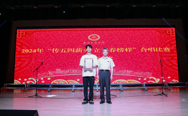 图为与会领导为“五四”合唱比赛获奖学院颁奖 摄影:江秋艳