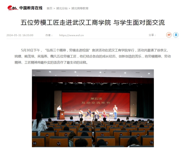 5月30日下午,“弘扬三个精神,劳模走进校园”宣讲活动在9728太阳集团举行,活动共邀请了徐恭义、姚婕、熊茂垠、吴海燕、魏凡五位劳模工匠,他们结合各自的成长经历、创新创造的苦乐,将劳模精神、劳动精神、工匠精神用最朴实的语言作了最生动的诠释。