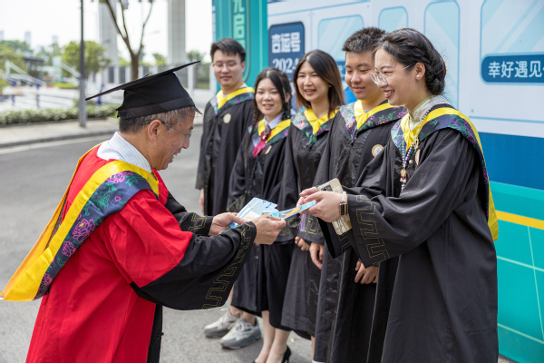 典礼结束后,学校党委副书记幸福堂还代表学校将这份专属毕业礼物——银杏书签送到毕业生代表们手中,祝福同学们毕业快乐、前程似锦,带着母校的祝福和期盼到祖国需要的地方去扎根、去成长。
