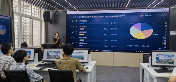 随后,付蒙老师面向2021级物流工程专业的学生、各学院教师等作了《集装箱铁水联运港口作业计划方案设计》的教学示范课。她向大家介绍了该课程的背景和目的,强调了港口作业计划设计在集装箱铁水联运中的关键作用,并从场景背景介绍入手,详细阐述了实验所处的虚拟环境以及实验所需掌握的知识点。她指出,通过虚拟仿真实验教学平台,学生可以模拟真实的港口作业场景,深入了解港口作业计划的制定和执行过程,掌握相关理论知识和实践技能。