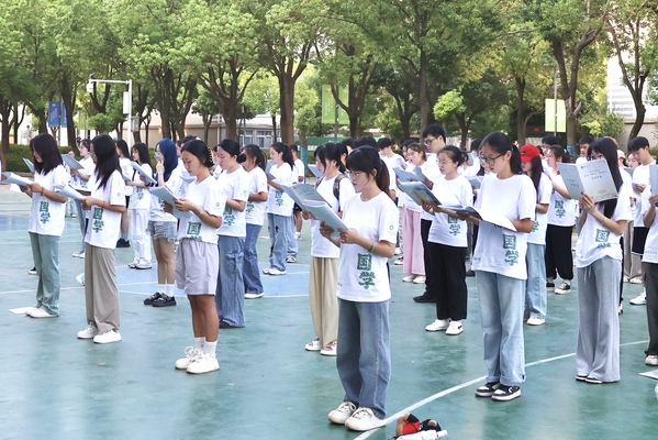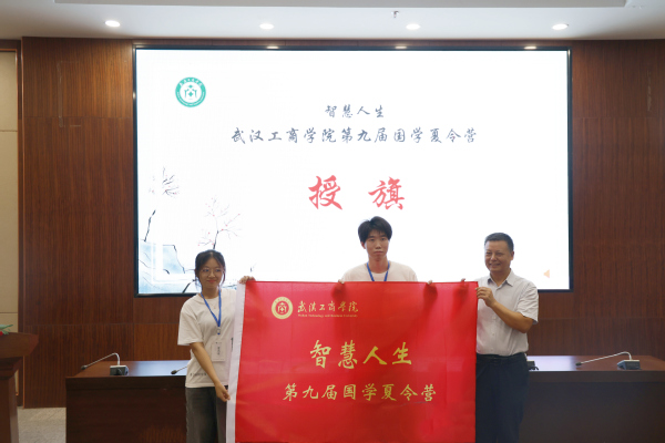 图为刘生元副校长为第九届国学夏令营营员授旗 摄影:芮雨欣