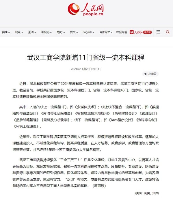 其中,入选的线上一流课程1门,即《多媒体技术》;线上线下混合一流课程7门,即《数据结构与算法设计》《劳动与社会保障法》《智慧物流技术与应用》《高级财务会计》《管理会计》《品牌战略管理》《无机及分析化学》;线下一流课程3门,即《Java程序设计》《刑法学总论》《环境工程原理》。