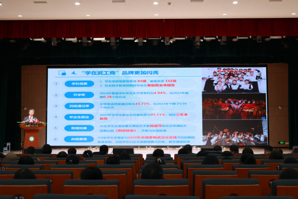 孔建益校长代表学校做年终工作报告,全面回顾了学校2024年的工作,部署2025年的主要工作。他指出,2024年,全体师生员工在董事会的大力支持下,扎实推进实施“十四五”事业发展规划,奋力开展审核评估对标建设,踔厉奋发、挺膺担当,取得了令人振奋的新成绩:一是迎评促建工作成效显著;二是课程建设和教育教学改革再结硕果;三是国家基金实现“大满贯”,科研收入实现跨越式增长;四是“学在武工商”品牌更加闪亮;五是生源质量和社会声誉再次实现质的飞跃;六是硬件设施和数字化建设迈上新台阶;七是“最温暖大学”温暖入心。