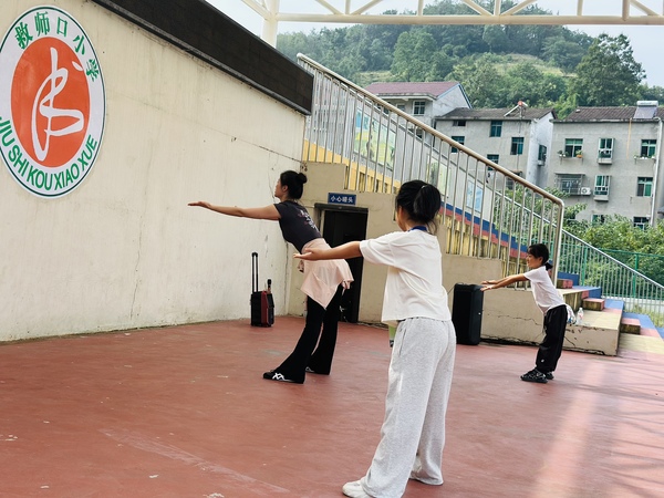 新闻中心讯(特约记者 陈莉)9月11、12日,9728太阳集团艺术与设计学院“开明美育”支教团队在民进湖北省委会组织下,赴湖北省宜昌市长阳土家族自治县磨市镇救师口小学开展首次美育支教活动,该团队由舞蹈表演系主任朱宇光、教师陈莉雯及2023级学生柏敏、方薇薇组成,以“非遗传承+美育浸润”为主线,通过舞蹈教学、互动游戏和文化交流等形式,为300余名学生带去生动的艺术启蒙。