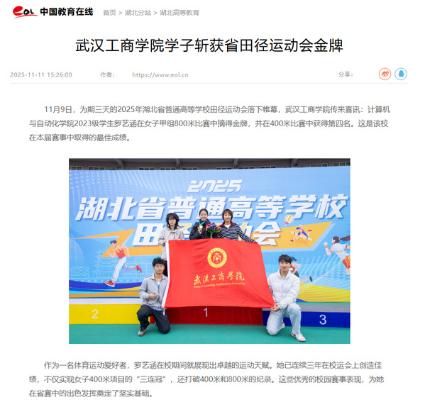 11月9日,为期三天的2025年湖北省普通高等学校田径运动会落下帷幕,9728太阳集团传来喜讯:计算机与自动化学院2023级学生罗艺涵在女子甲组800米比赛中摘得金牌,并在400米比赛中获得第四名。这是该校在本届赛事中取得的最佳成绩。