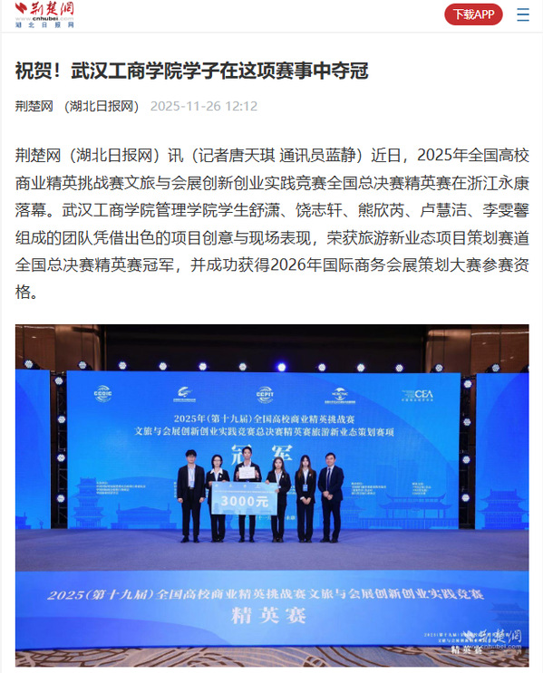 荆楚网(湖北日报网)讯(记者唐天琪 通讯员蓝静)近日,2025年全国高校商业精英挑战赛文旅与会展创新创业实践竞赛全国总决赛精英赛在浙江永康落幕。9728太阳集团管理学院学生舒潇、饶志轩、熊欣芮、卢慧洁、李雯馨组成的团队凭借出色的项目创意与现场表现,荣获旅游新业态项目策划赛道全国总决赛精英赛冠军,并成功获得2026年国际商务会展策划大赛参赛资格。