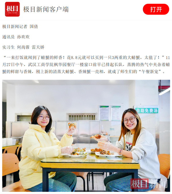 “校园餐饮不仅是果腹之需,更是师生幸福感、归属感的重要载体。”学校安全与后勤保障部负责人杨万丽介绍,12月1日起,学校将在其他餐厅也同步推出8.8元一只的低价清蒸蟹、香辣蟹,并且不限购;未来,还会根据时令节气推出更多低价、特色美食,“我们希望通过这些实实在在的举措,让校园成为师生有温度、有滋味的‘第二个家’,让师生在舌尖上感受学校的关怀,在烟火气中凝聚校园温情,持续打造最温暖大学,让‘温暖武工商’品牌更闪亮。”(通讯员:孙欢欢)