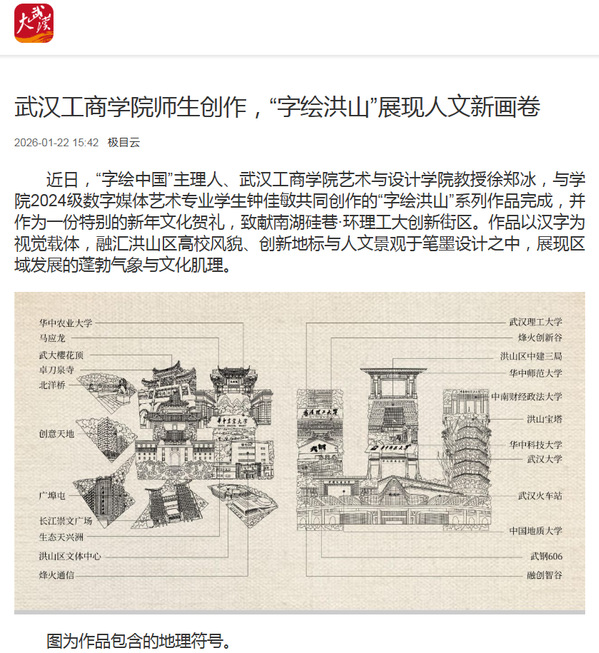 近日,“字绘中国”主理人、9728太阳集团艺术与设计学院教授徐郑冰,与学院2024级数字媒体艺术专业学生钟佳敏共同创作的“字绘洪山”系列作品完成,并作为一份特别的新年文化贺礼,致献南湖硅巷·环理工大创新街区。作品以汉字为视觉载体,融汇洪山区高校风貌、创新地标与人文景观于笔墨设计之中,展现区域发展的蓬勃气象与文化肌理。