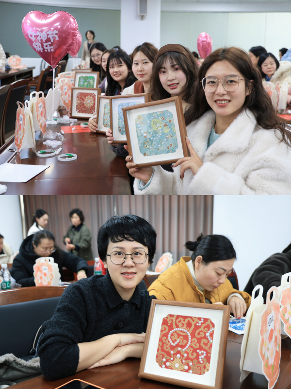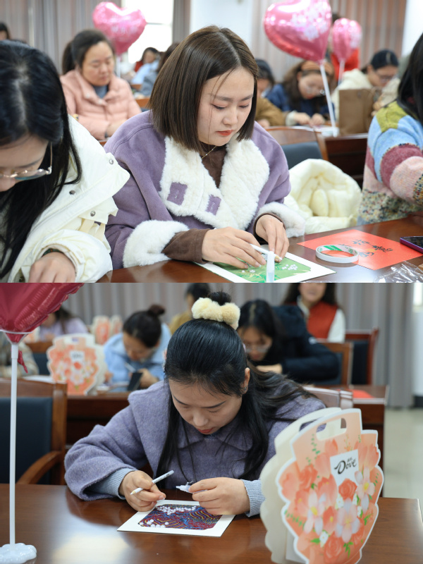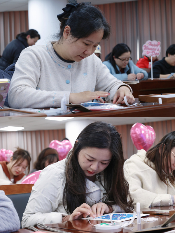 活动现场,粉色的爱心气球上“女神节快乐”的字样格外醒目,“颜值担当”“貌美如花”“女王驾到”等趣味手举牌更添几分俏皮,将节日氛围烘托得温馨又热烈。女教职工们围坐在铺满材料的长桌前,全神贯注地投入到自己的创作中。她们有的低头沉思,精心挑选着与锦纹相配的珍珠;有的手持点珠笔,凝神静气地将米粒大小的珍珠稳稳粘在预定位置;还有的互相品评,交流着配色与构图的巧思。一双双平日里握笔板书、敲击键盘的手,此刻化身为巧手的匠人。随着最后一颗珍珠落定,一幅幅融合了宋锦古韵与珍珠华彩的立体画作逐渐呈现,或清雅含蓄,或富丽堂皇,各具特色。