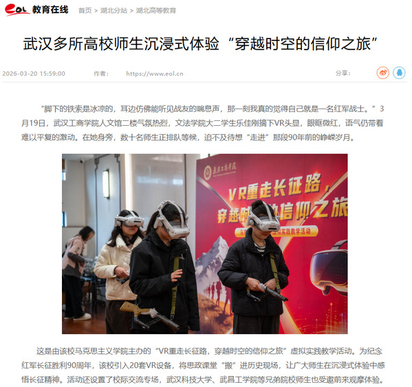 这是由该校马克思主义学院主办的“VR重走长征路,穿越时空的信仰之旅”虚拟实践教学活动。为纪念红军长征胜利90周年,该校引入20套VR设备,将思政课堂“搬”进历史现场,让广大师生在沉浸式体验中感悟长征精神。活动还设置了校际交流专场,武汉科技大学、武昌工学院等兄弟院校师生也受邀前来观摩体验。