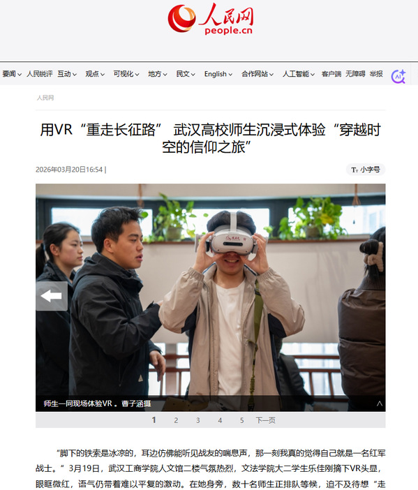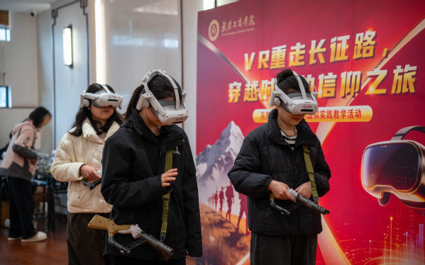 这是由该校马克思主义学院主办的“VR重走长征路,穿越时空的信仰之旅”虚拟实践教学活动。为纪念红军长征胜利90周年,该校引入20套VR设备,将思政课堂“搬”进历史现场,让师生在沉浸式体验中感悟长征精神。活动还设置了校际交流专场,武汉科技大学、武昌工学院等兄弟院校师生也受邀前来观摩体验。
