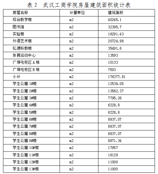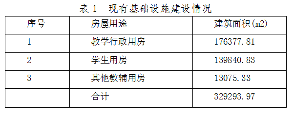 截止“十二五”末,学校已完成建筑面积329293.97万㎡。建有教学楼、实验中心、图书馆、体育馆、大学生活动中心和田径运动场、球类运动场等现代化的教学科研楼群,拥有电子信息工程、经管、生物、模拟法庭、企业经营模拟实验室、非线性编辑实验室和嵌入式实验室等各个专业实验室和156个校内外实习实训基地。标准化学生公寓、大型学生食堂、超市及校医院等生活设施完善、功能齐全。具体见下表。