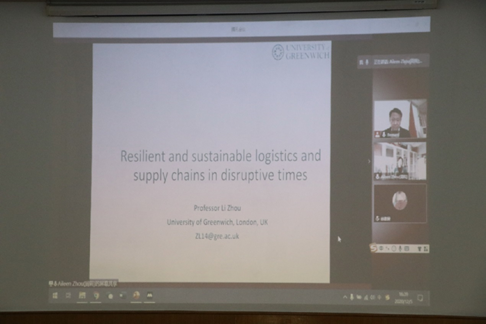 接着,格林威治大学物流系主任周莉教授以“Resilient and sustainable logistics andsupply chains in disruptive times”为主题介绍了疫情对供应链、物流以及对企业的影响以及供应链弹性研究,并与青年学者们就这一主题展开了线上和线下讨论。