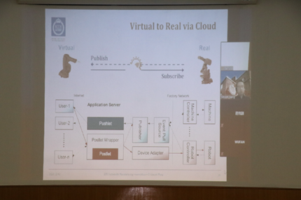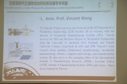 在下午的后疫情时代可持续交通物流协同创新发展学术讲座和交流上,瑞典皇家理工大学ITM学院的老师王曦博士以“Cyber-Physical ManufacturingConsidering Sustainability”为主题介绍了社会、环境、经济三个可持续经济的可持续性,具体说明基于云的可持续性生产,介绍了云服务的优点:可访问性、容测能力、云生产服务,并进一步解释云服务和物流的关系,展开论述了环境的可持续性。