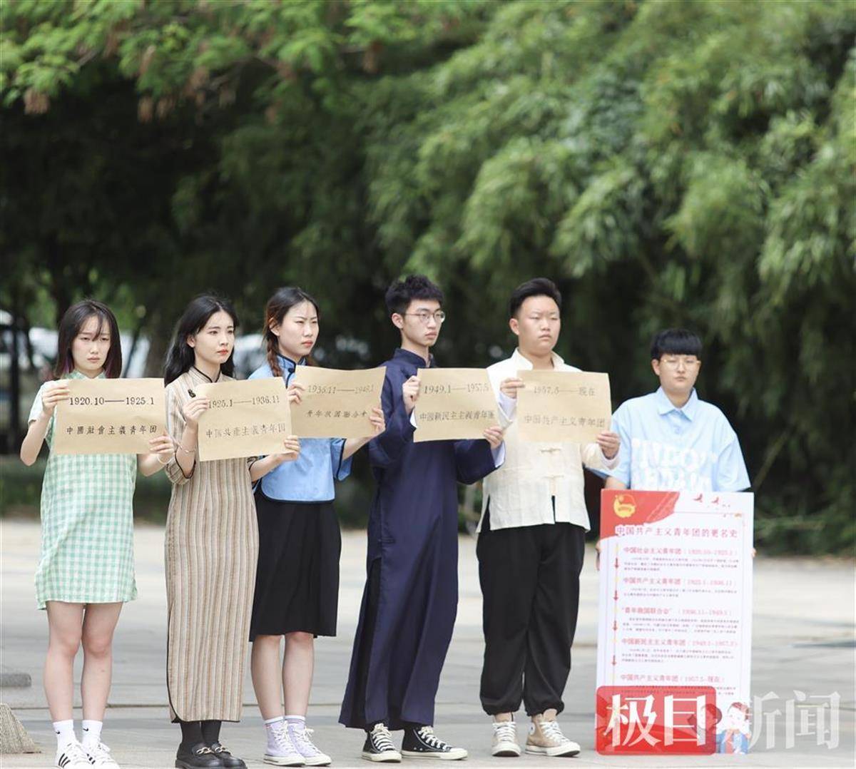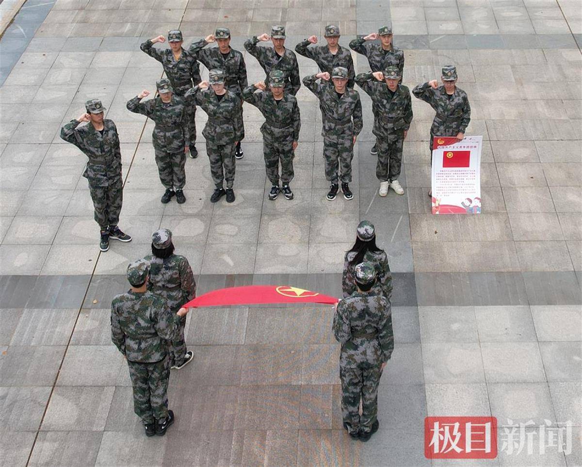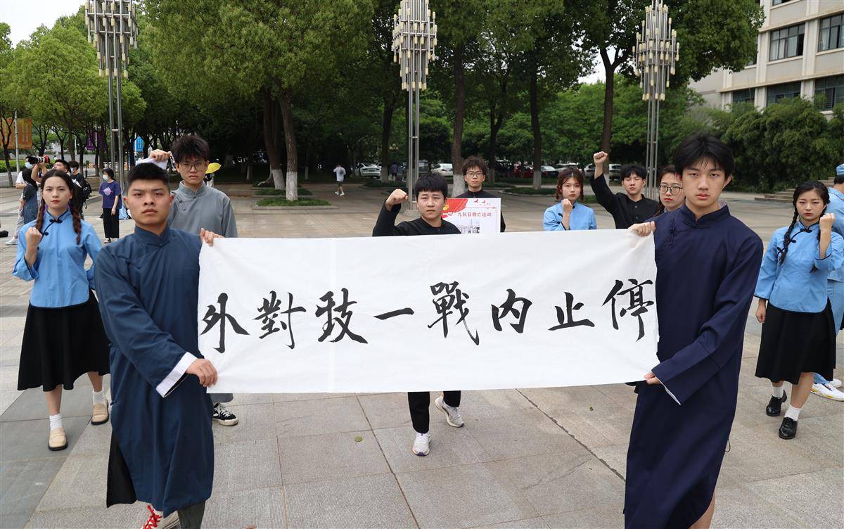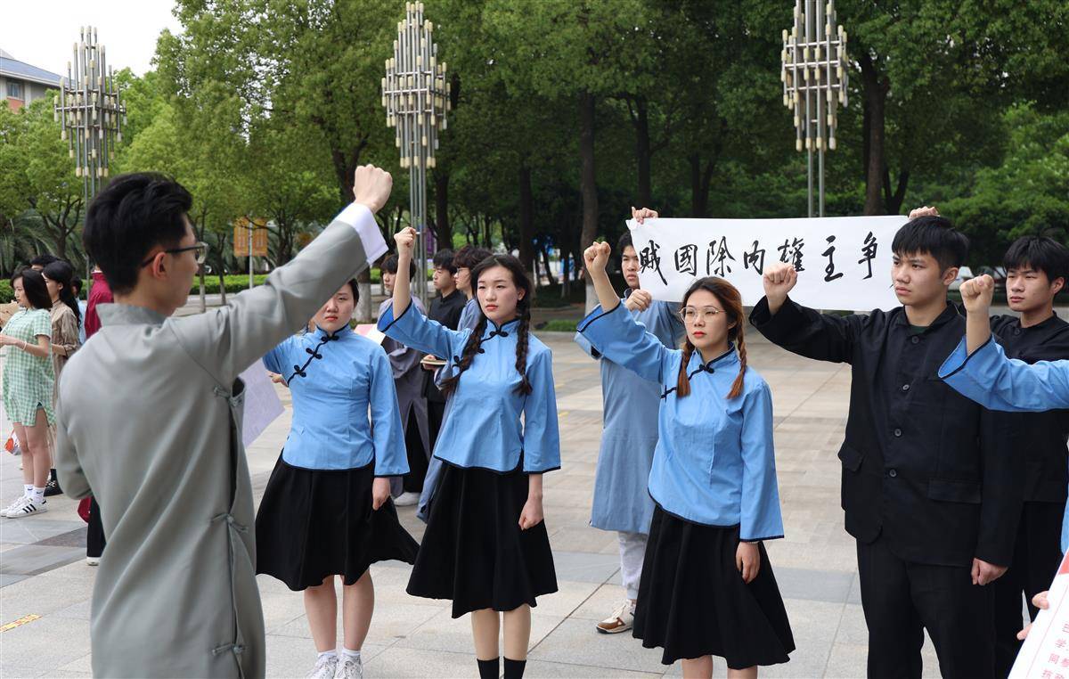 快闪现场,身着民国服装的青年学生慷慨激昂高举“外争主权,内惩国贼”“停止内战一致对外”等标语,致敬和传承先辈们的革命精神;身穿防护服、头戴面罩的青年志愿者,正在测温,开展抗疫志愿服务;还有一身迷彩服的学生正面对团旗,以最宏亮的声音庄严宣誓……