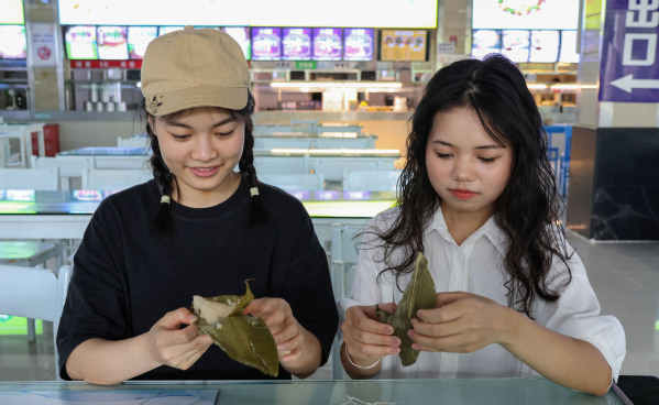 据学校后勤管理部工作人员介绍,去年和今年的端午节,学校都向全校学生免费发放了粽子,今年发放的粽子有豆沙、蜜枣和八宝3个口味,全校学生可凭统一发放的餐券前往学校一食堂和二食堂一楼免费领取1个粽子。在1栋学生宿舍332寝室,学生们拿着粽子高兴地拍照留念,并一起品尝。寝室内文法学院大二学生詹兰芳一边吃粽子一边介绍道:“我来学校不到两年,就已经吃了两次免费的校庆餐和两次免费的粽子了,粽子甜甜的,心里暖暖的!”