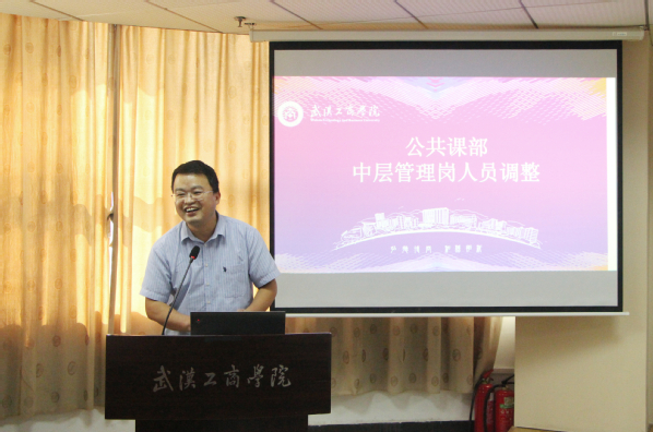 图为刘春校助宣读《关于公共课部中层管理岗人员调整的通报》 摄影:陈晓丹