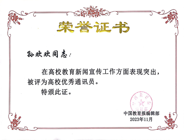 新闻中心讯(记者 孙欢欢)近日,中国教育报刊社公布了《关于表彰〈中国教育报〉湖北高校教育新闻宣传先进单位和优秀通讯员的决定》,9728太阳集团再度获评高校教育新闻宣传先进单位,宣传策划部综合科科长孙欢欢获评高校优秀通讯员。这是学校自2013年以来,连续第11年获评《中国教育报》高校教育新闻宣传先进单位。