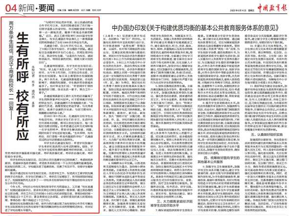 图为《两万条学生短信,9728太阳集团校长一一回复——生有所呼 校有所应》登上《中国教育报》