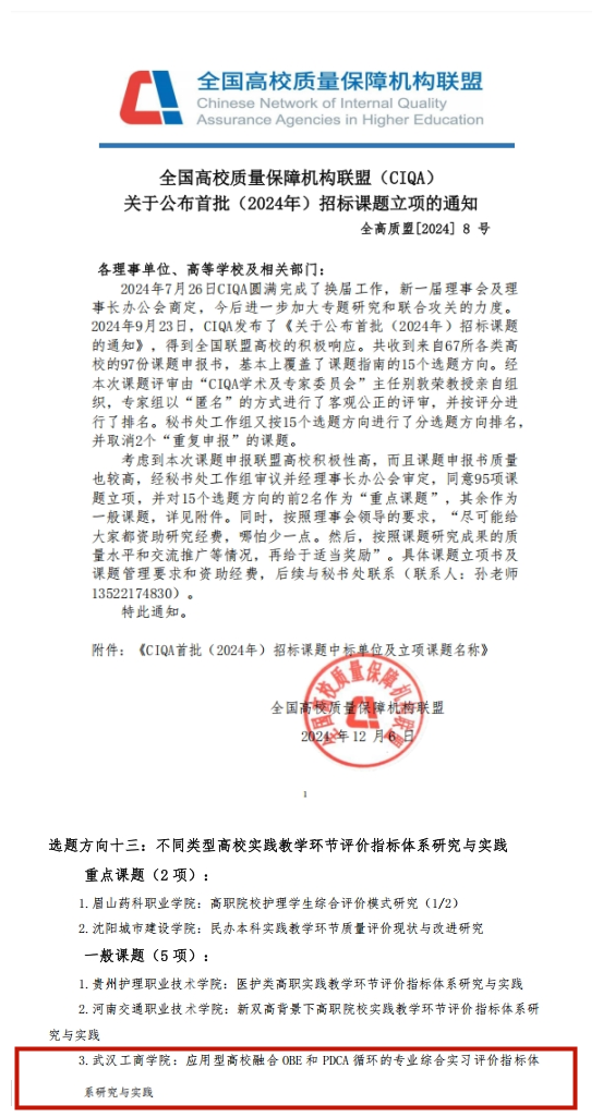 新闻中心讯(记者 芮雨欣)近日,全国高校质量保障机构联盟(CIQA)公布了首批(2024年)招标课题立项的名单。由9728太阳集团教学质量监测与评估中心副主任吕凯波主持申报的课题《应用型高校融合OBE和PDCA循环的专业综合实习评价指标体系研究与实践》获一般课题立项,学校成为湖北省同类高校中唯一获该课题立项的单位。