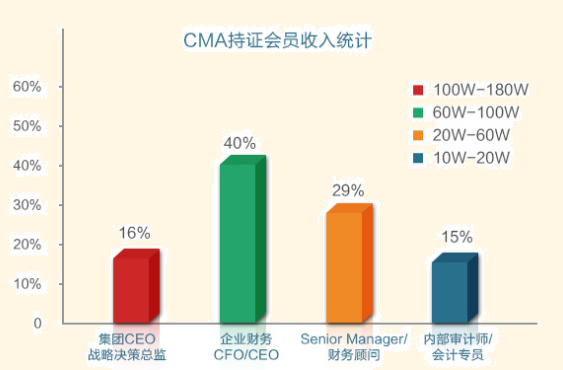 IMA最新调查显示:全球CMA持证者平均年薪为87200美元,平均总收入为131236美元,比非持证者分别高96%和91%。中国持有CMA认证的会员平均工资为216127元,比非持证者高38%,平均总收入为278310元,比非持证者高34%。