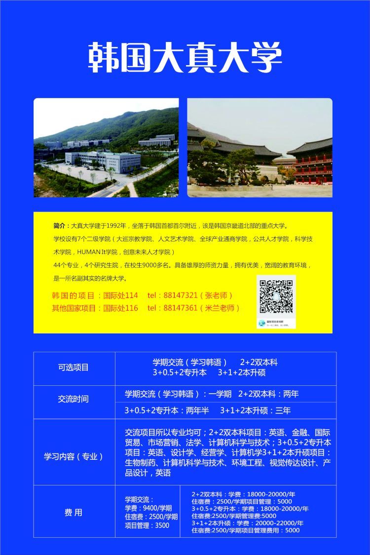 2.赴韩国大真大学交流时间:2018年9月-12月,为期一学期。
