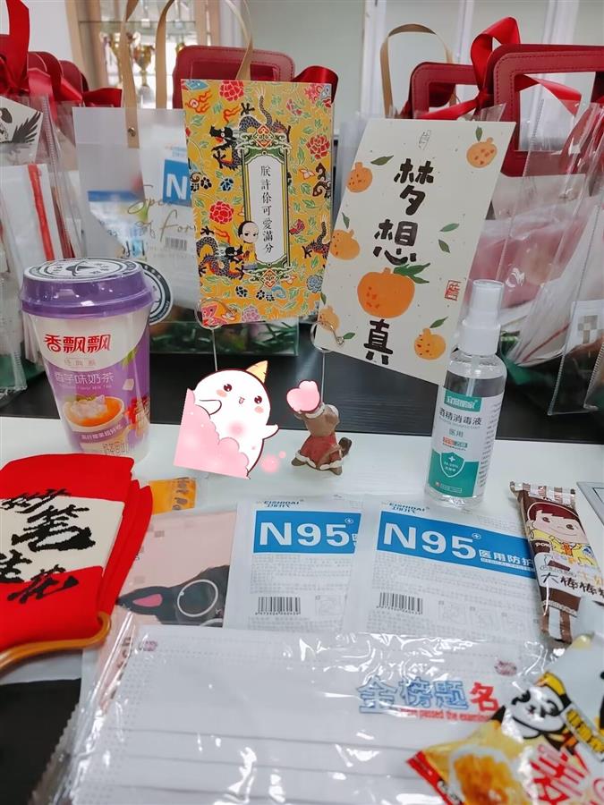 “里面的物品饱含着我们对考研学生真挚的爱和美好的期盼,寓意‘榜上有名’的棒棒糖、‘信’心百倍的明信片、‘暖手暖脚更暖心’的奶茶和袜子,‘马到成功’的书签,加油打气的旺旺仙贝、‘面面俱到’的防疫口罩……”在现场发放福袋的该校环境与生物工程学院党总支书记陈玲细心介绍起了礼品的寓意。