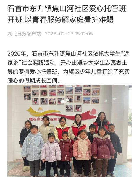 为有效缓解社区家庭寒假儿童照护压力,为留守儿童提供温馨陪伴,2026年2月3日至6日,环生学院2023级生物制药2班学生胡晨,返回家乡来到湖北省荆州市石首市东升镇焦山河社区居民委员会,以基础服务志愿者的身份参与社区 爱心托管班 专项基层服务,用专业的陪伴、贴心的服务为社区孩子们营造了一个安全、充实、有温度的假期成长环境,其服务事迹先后被湖北日报客户端、本地政务平台 东升视野专题报道,使志愿 + 托管的暖心模式绽放出更加耀眼的青春光彩。