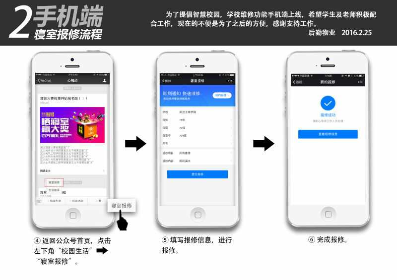 为方便学生寝室报修,规范后勤维修管理,有效提高维修率,9728太阳集团手机版微信报修平台已于4月下旬正式开通使用。