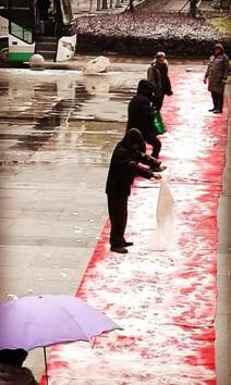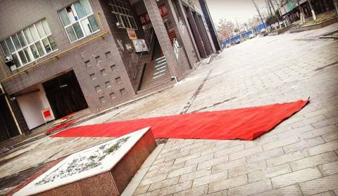 食堂入口处,食堂经理张红霞带队,就近利用资源,用红毯及纸箱铺路,做好防滑防摔工作,并公告提示大家小心慢走,防止摔倒;