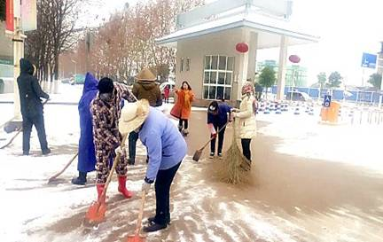 图为保洁管理员带领大家在二食堂周边清理积雪