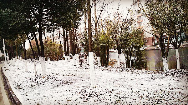 校内香樟树最耐寒数量也最多,工作人员为其刷白,到目前为止,全校千余株香樟树都穿上了“白毛衣”;