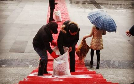 综合楼入口,环境维护中心赵训武经理带领工作人员铺设草袋和红地毯,方便教职人员出入。
