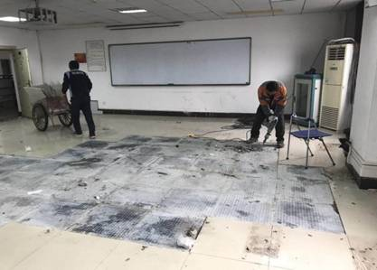综合楼7楼多间教室地砖翘起,为保障正常的教学秩序,维护学生安全,物业维修人员在假期予以施工。