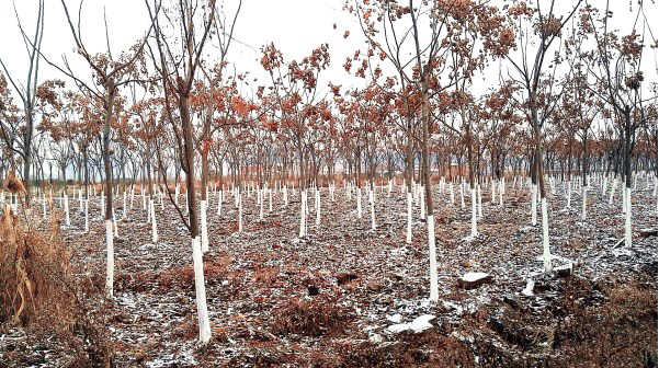 小树苗采用全包裹方式防寒,穿上彩色的冬衣。