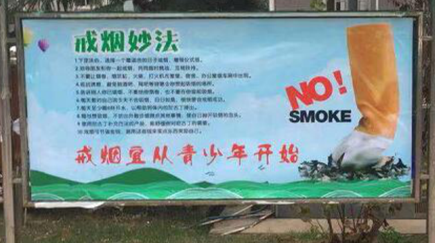 其次,后勤以“丢掉香烟,远离烟草”为核心内容,以“香烟是魔鬼的契约”为口号,呼吁广大师生员工尽量不抽烟,倡导以运动为主的健康生活方式,并在综合楼、外语楼、学生二食堂级6-9东主干道两侧积极开展禁烟控烟宣传工作。