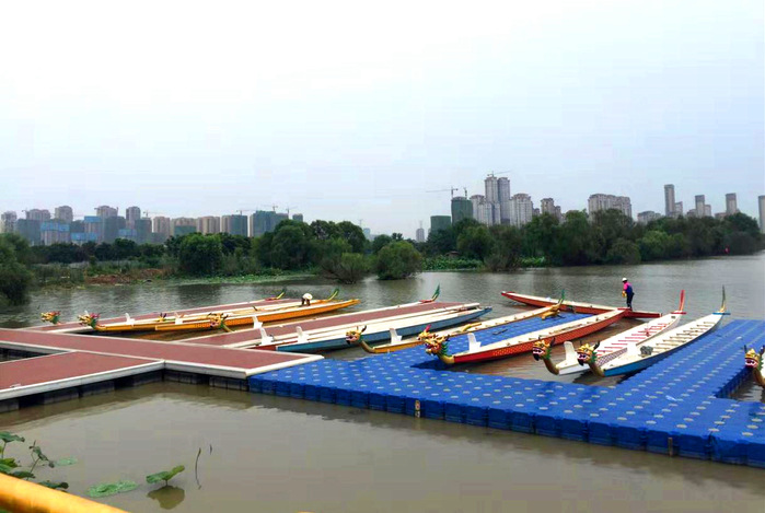 八点,后勤保障组的负责人跟我们介绍,12日下午,工程组已搭建好浮动码头,并对码头和船只逐一进行了安全检查;土建组已在沿湖路的泥泞路面上铺设了绿毯,确保比赛场地安全。