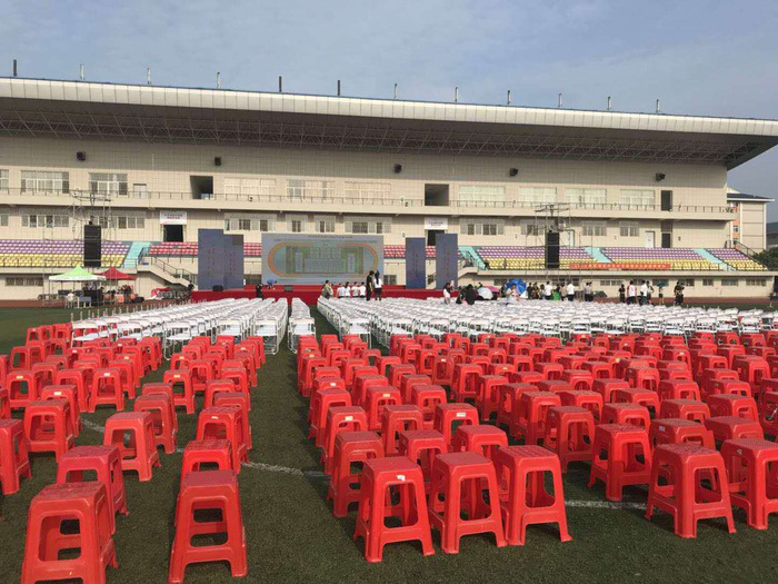 清晨六点,后勤统一战线各就各位,开始为活动现场做准备工作。保洁组人员在赛场周边不间断的巡查,确保外围环境清爽整洁;安保组人员集合至体育馆操场集训,按责任区加强巡视;服务组人员至休息区巡查,为参赛队员提供咨询及饮料供应;会场组正在布置会场所需的设备和座椅,医疗组稍后也带着应急药品和器械进入会场待命。明亮的阳光照在他们忙碌的身影上,给这个早晨赋予了蓬勃的朝气及动感美。