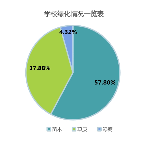 据统计,截止2019年7月31日,学校总绿化面积160791㎡,其中苗木占地面积92941㎡,占绿化面积比例为57.8%;草皮占地面积60900㎡,占绿化面积比例为37.88%;绿篱占地面积6950㎡,占绿化面积比例为4.32%。